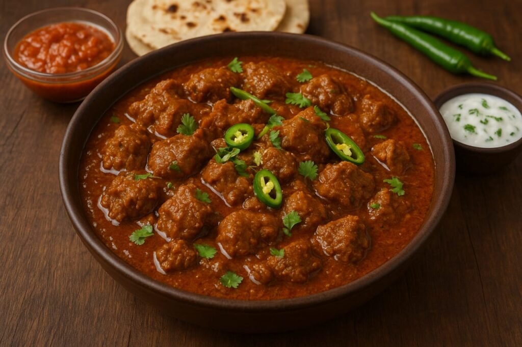 جب گوشت گل جائے اور گریوی گاڑھی ہو جائے، تو سبز مرچ ڈال کر 2 منٹ دم پر رکھیں۔ - گارنش اور سرو کرنا: